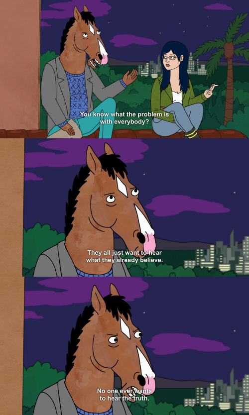 BoJack Horseman: You know what the problem is with everybody? They all just want to hear what they already believe. No one ever wants to hear the truth.