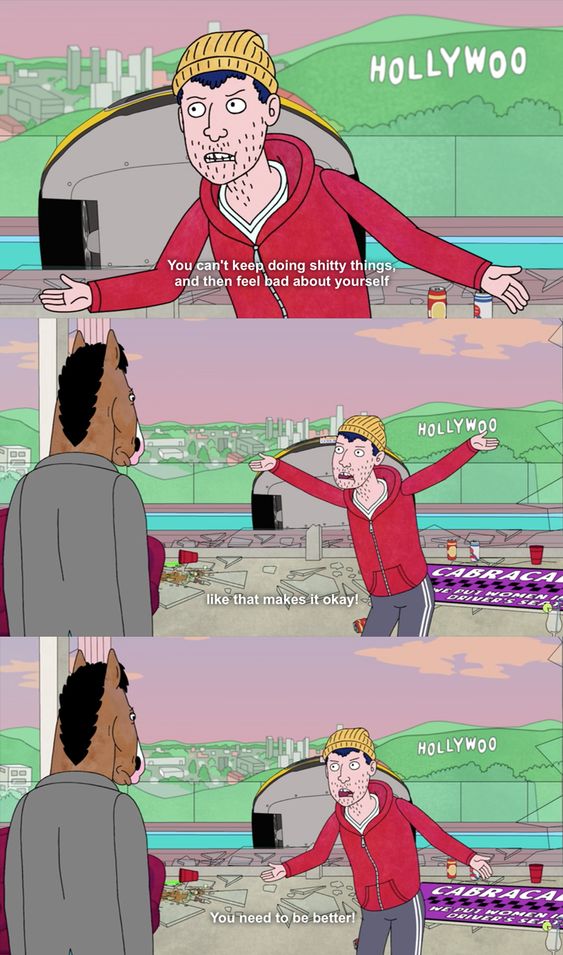 Todd Chavez: You can’t keep doing this! You can’t keep doing shitty things and then feel bad about yourself like that makes it okay! You need to be better! BoJack, just stop. You are all the things that are wrong with you. It’s not the alcohol, or the drugs, or any of the shitty things that happened to you in your career, or when you were a kid. It’s you. Okay? It’s you.